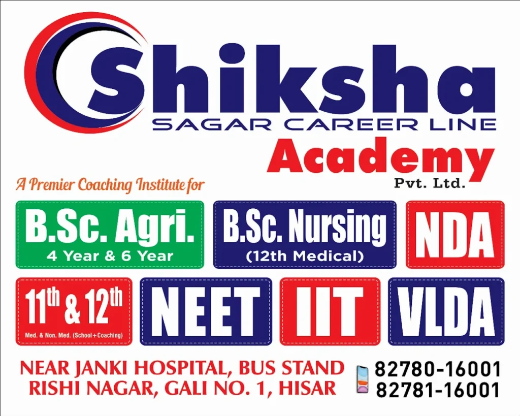 elcome to Shiksha Academy, where we nurture young minds for academic excellence and professional success. Our coaching center in Rishi Nagar, Hisar offers specialized programs for Class 11th, Class 12th BSc Agriculture, BSc Nursing, VLDA, NEET, IIT, and NDA. With personalized attention and state-of-the-art facilities, we empower students to excel in their studies and beyond. Join us and embark on a journey towards a brighter future.